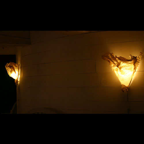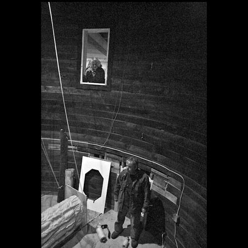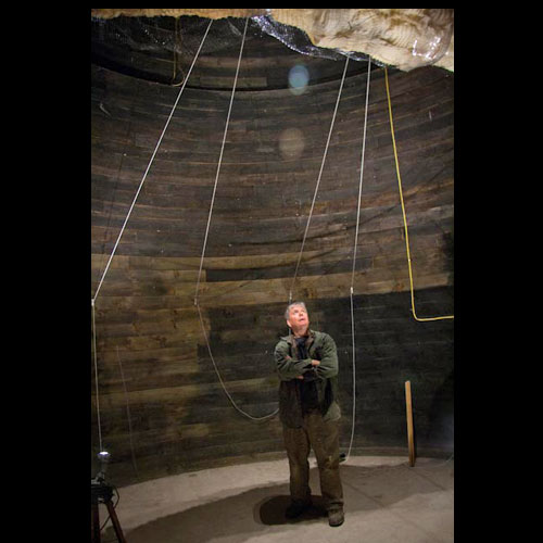 The giant silo was the center of the round barn. We placed lit sconces along the outside wall, directing the public to the steps leading up to the viewing window .